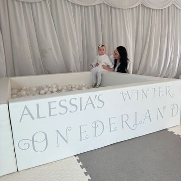 This set up includes 12ftx8ft Ball pit, balls, mats, fences, and 2 slides with two step ladders.