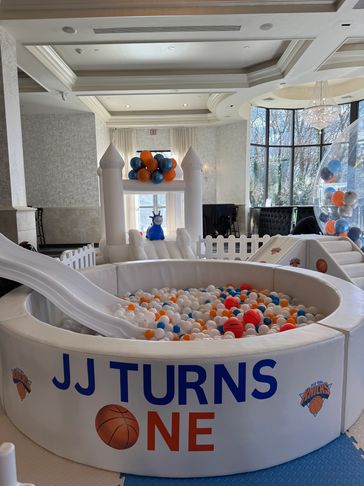 This set up includes 10ft ball pit with a single large slide, mats, fences, and balls.